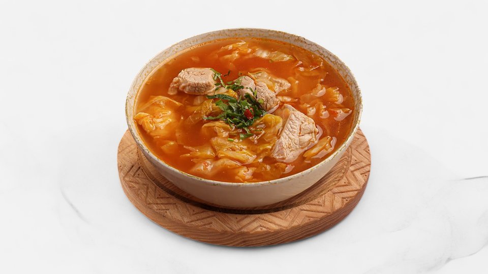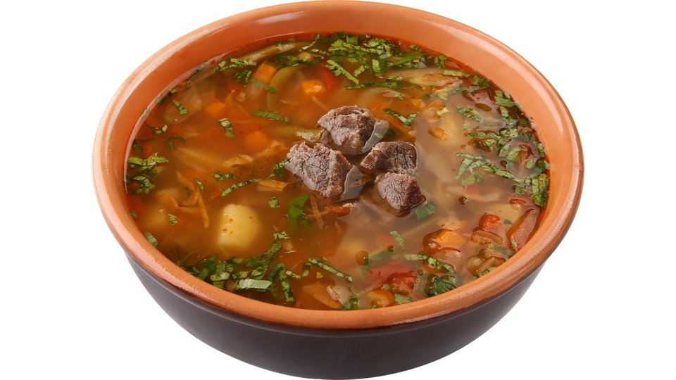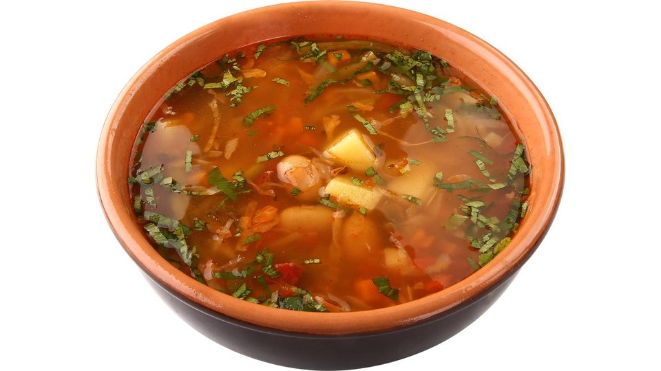 Carne de vită, cartofi, ceapă, fasole, morcovi, țelină, ardei gras, ulei, borș acru, fasole verde, verdeață, foi de dafin, sare, piper, ardei iute 400/20 g