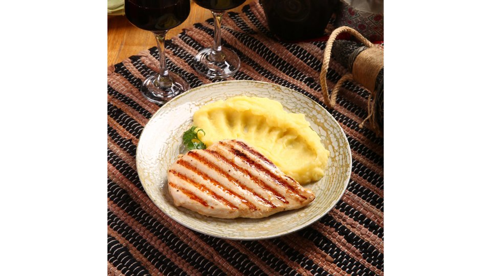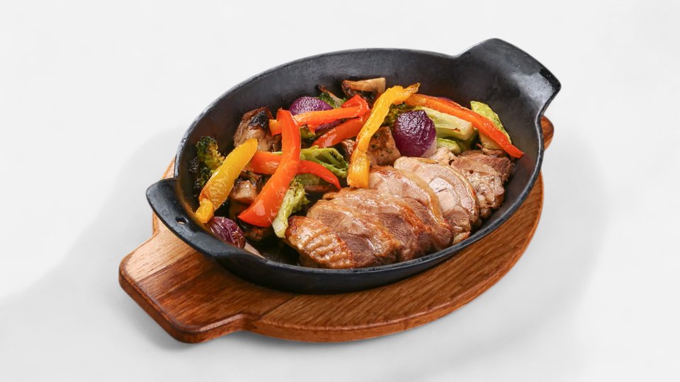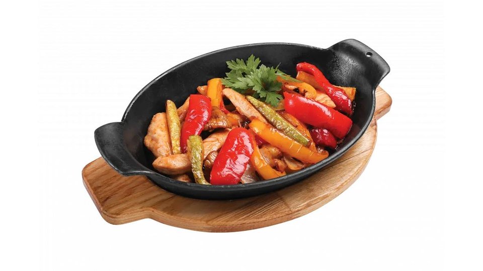 Pulpă de curcan, dovlecel, ceapă rosie, ciuperci, broccoli, ardei gras, sare, piper, ulei.150 g / 200 g