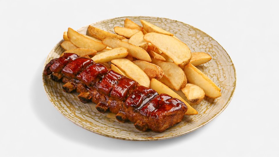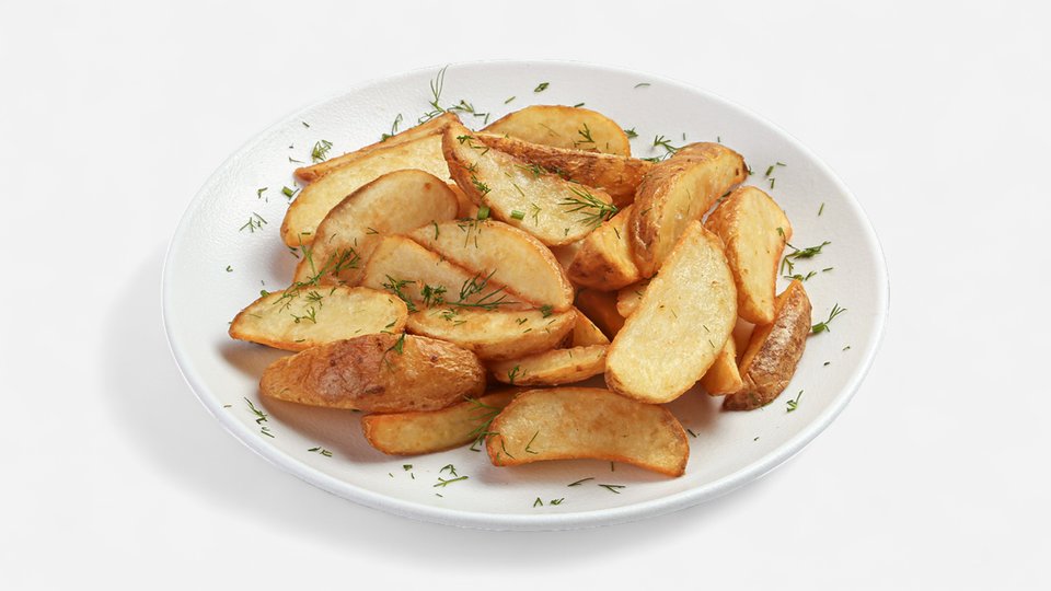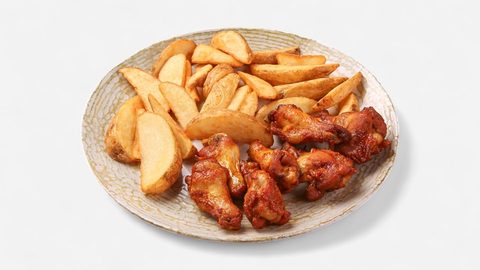 Aripi de pui marinate, cartofi wedges, sare, sos soia, condimente 200/150 g