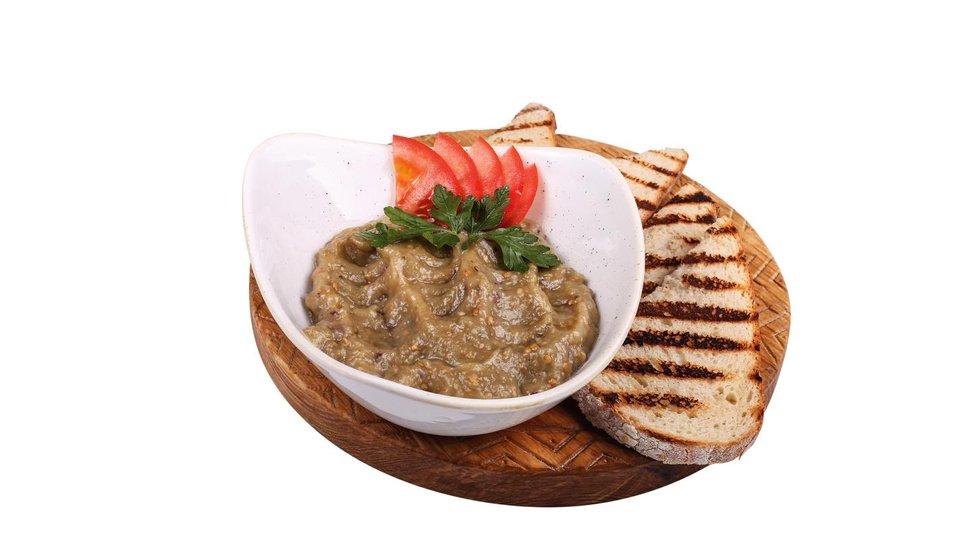 Vinete coapte, roșii, ceapă roșie, ulei, sare, verdeată, pâine 200 g