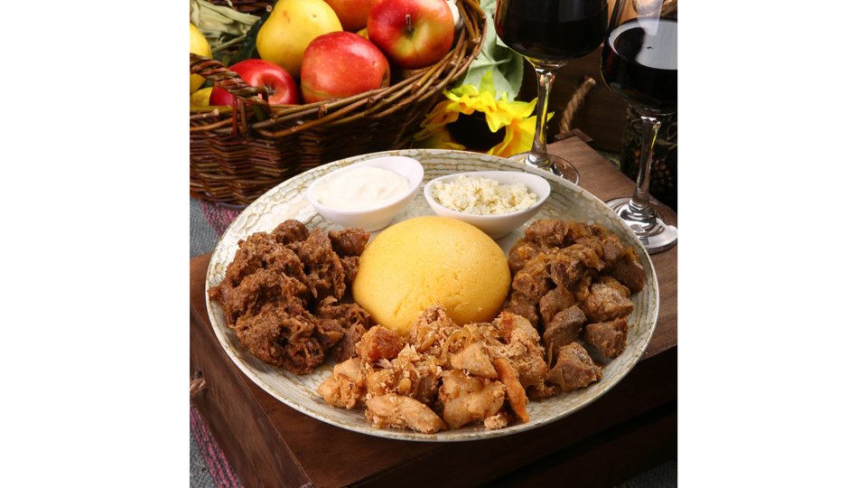 Ceafă de porc proaspătă și afumată, cârnați afumați, gogonele murate, telemea, smântână, mămăligă, lapte, sare, piper, untură, frunză de dafin .200/200/80/50/50 gr