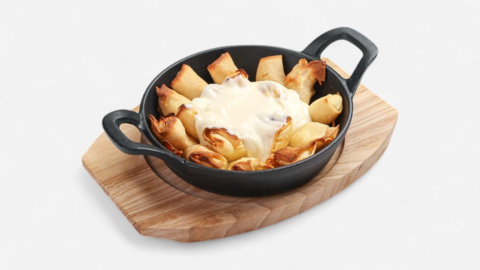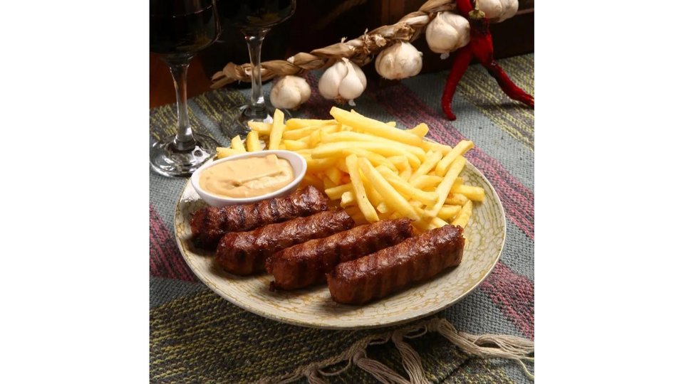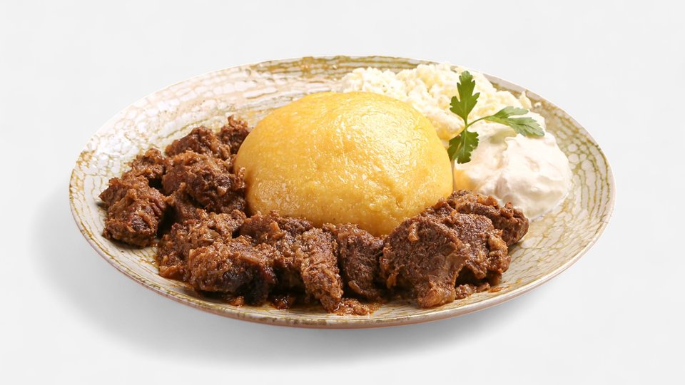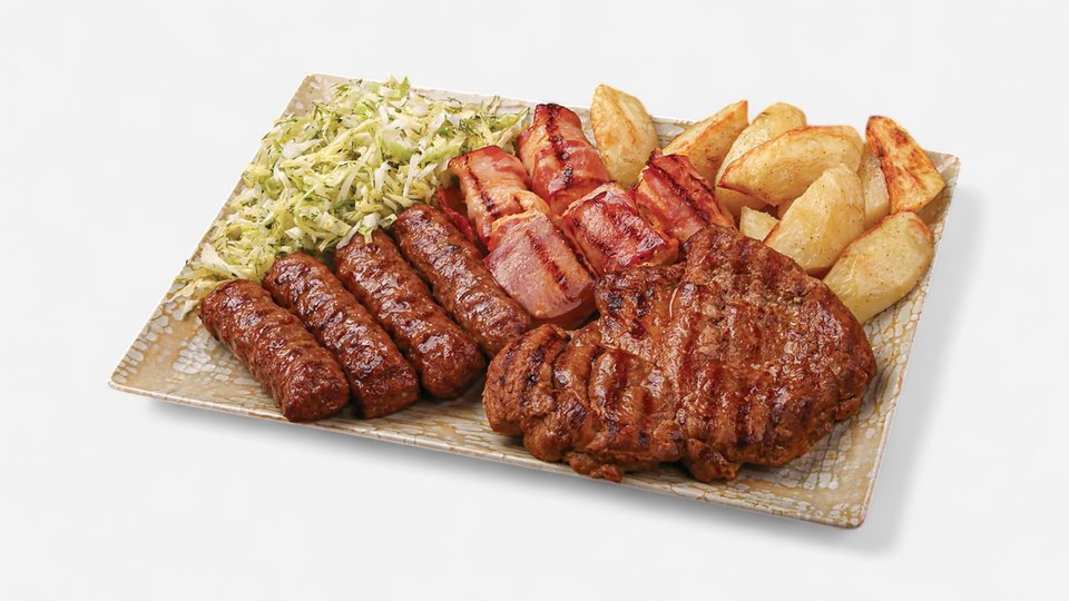 Carne de vită sau de miel, carne de pui, carne de porc, ceapă, condimente, mămăligă , lapte, smântână, telemea de oi, sos soia , usturoi 1100 gr