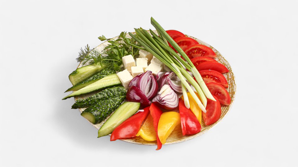 Roșii, castraveți, ceapă rosie, ardei gras, ceapă verde, telemea de oaie, mărar, pătrunjel. -320g