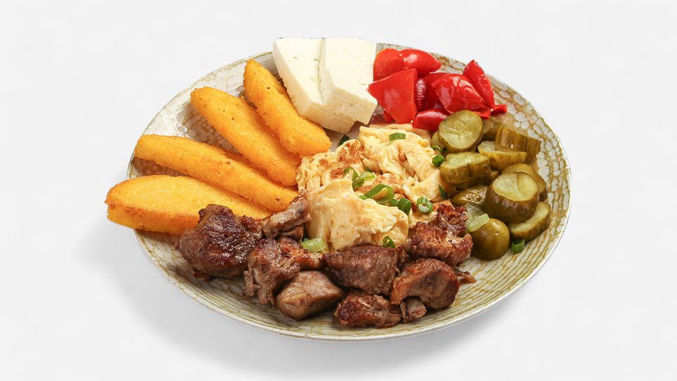 Mămăligă prăjită,telemea de oi,gogoșari în oțet ,castraveți marinați,ceapă verde,carne de porc coaptă,ouă - 450g