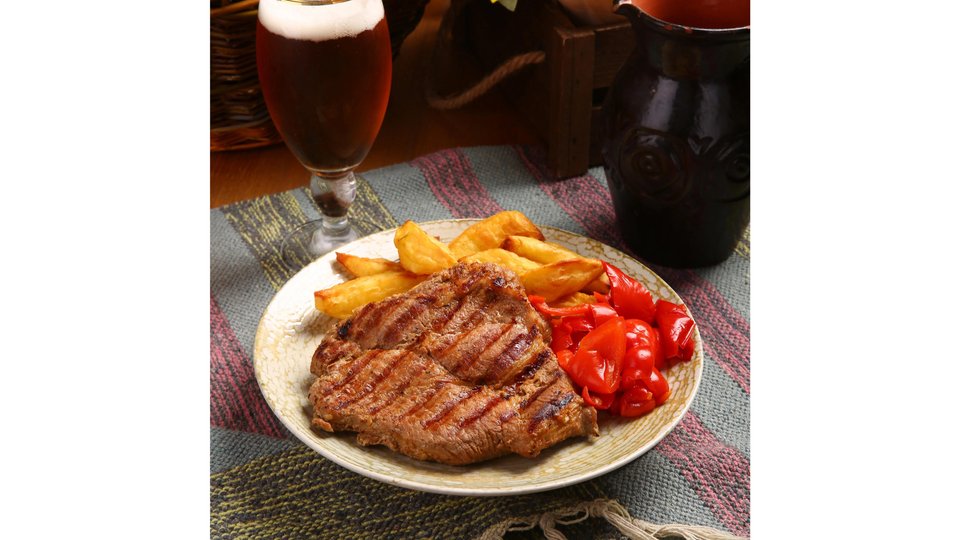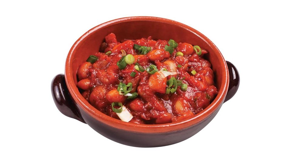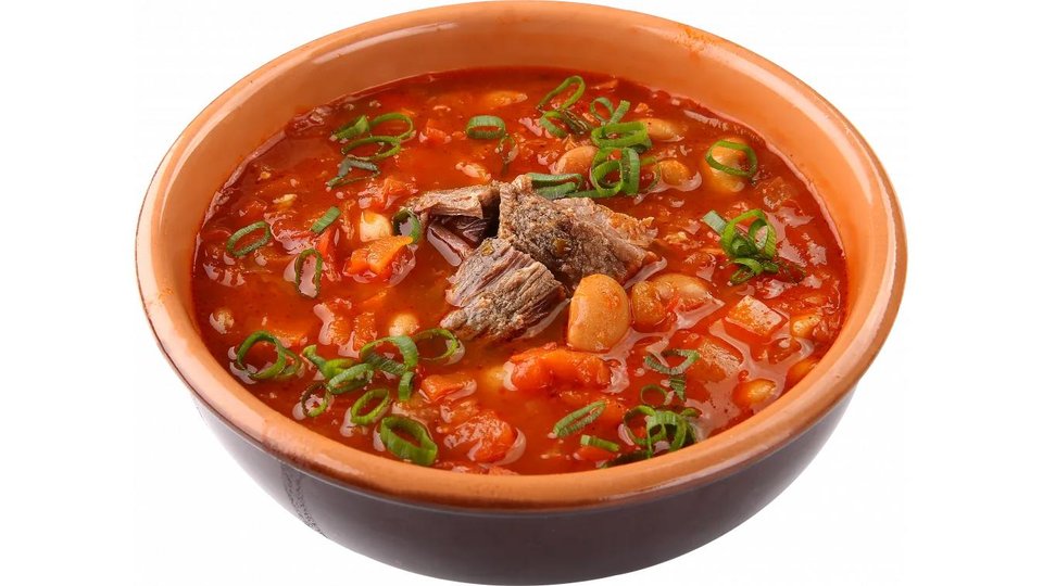 Carne de vită, fasole, ceapă, morcov, țelină, roșii, ardei gras, sare, piper, ulei, foi de dafin , verdeață, ardei iute 400 g / 20 g