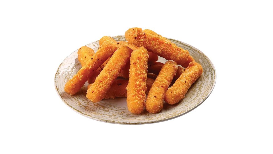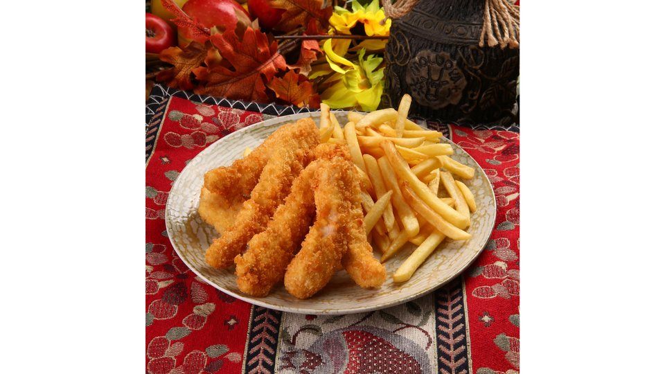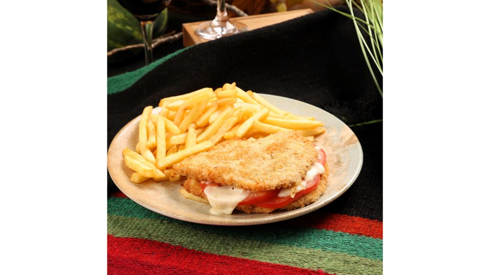 Carne de porc, făină, ouă , roșii, pesmet panko , brânză de burduf , ulei, cartofi pai, sare 320/150