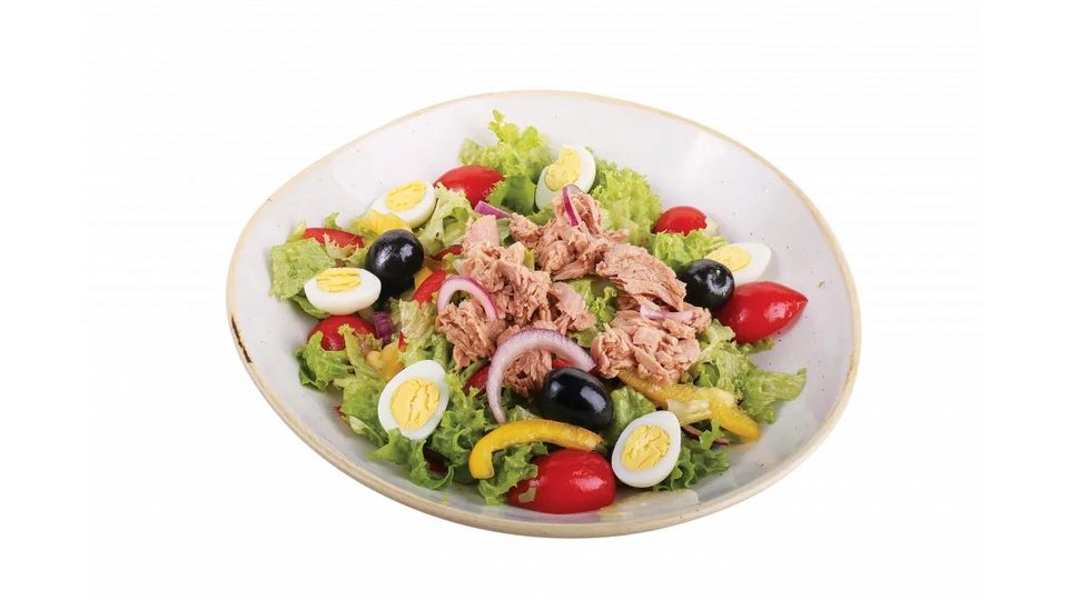 Ton, salată verde, roșii cherry, ouă prepeliță, ardei gras, măsline, ceapă roșie, ulei masline 300 gr