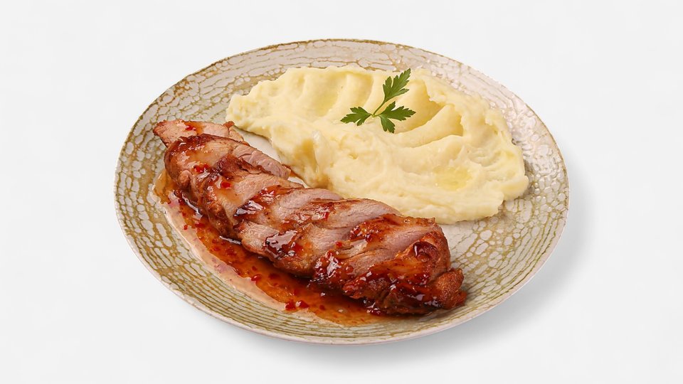 Mușchi de porc gătit lent, cartofi, lapte, unt , sare, sos unaghi, condimente, sare 450 gr