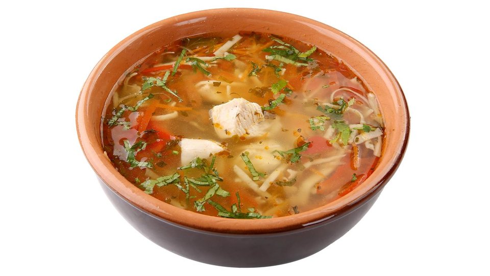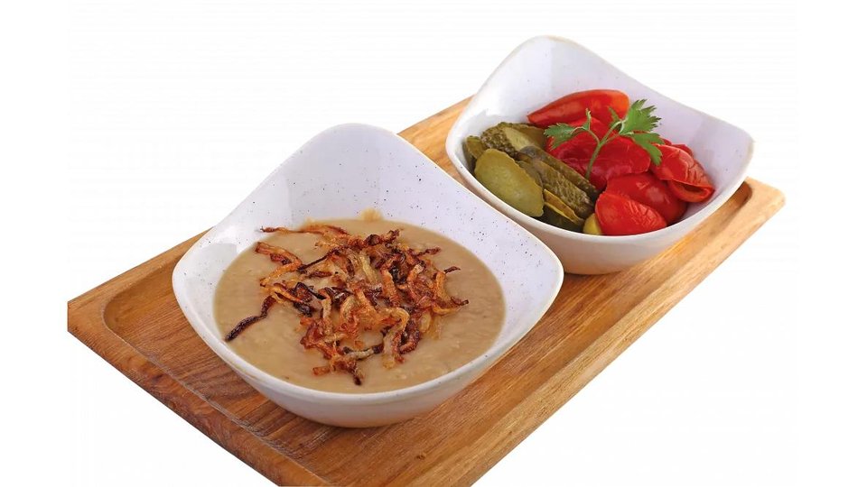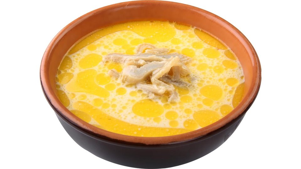 Supă de vită, smântână, burtă de vită, gălbenuș de ou, morcov, ceapă albă, usturoi, ardei iute 400 g / 20 g