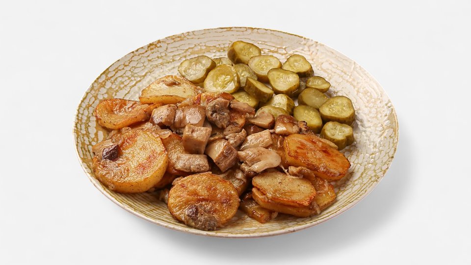 Cartofi, hribi, ceapă, usturoi, sare, ulei, sare, castraveți marinați. 350 gr