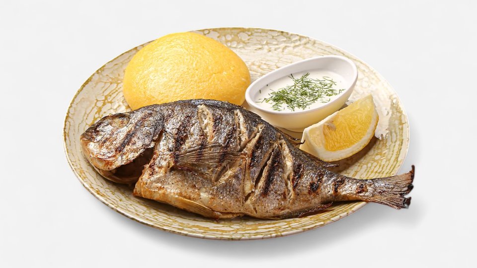 Doradă, mămăligă, mujdei, lămâie. 250/150/20 gr