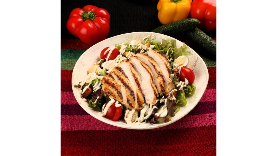 Salata, carne de pui, roșii, ouă, crutoane, sos de maioneză, lapte, usturoi, verdeață 350 g