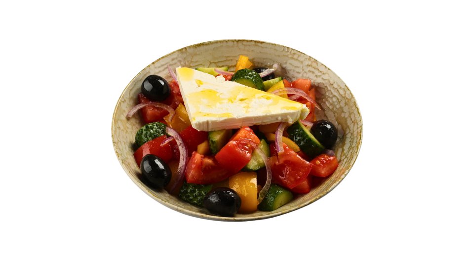 Roșii, castraveți, ardei gras, telemea de oi, masline, ceapă roșie, ulei masline, verdeață 350 g