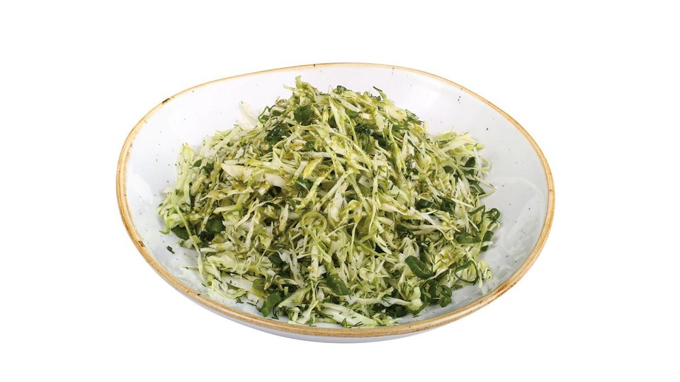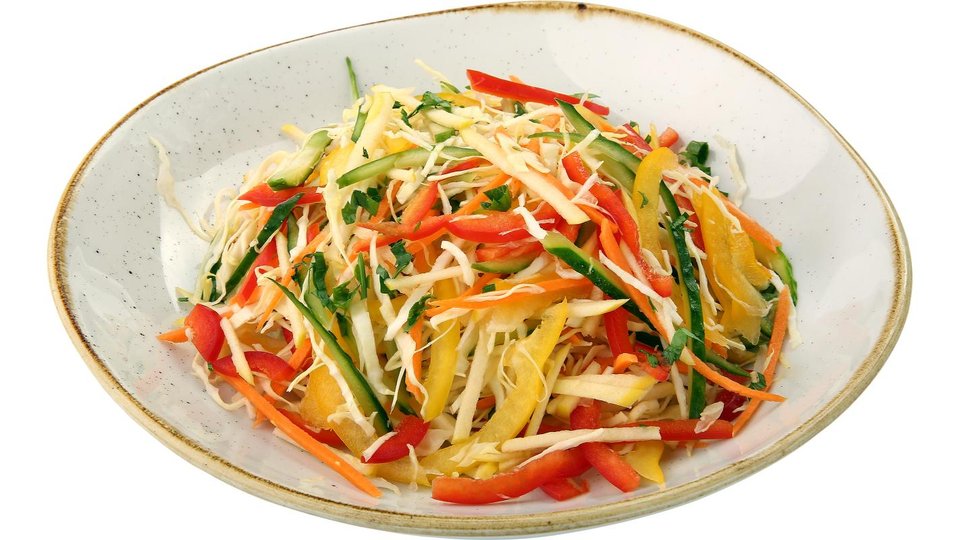 Varza,castravete, morcov, ardei gras, țelină, măr, verdeață, suc de lămâie, ulei de măsline, sare 270 g