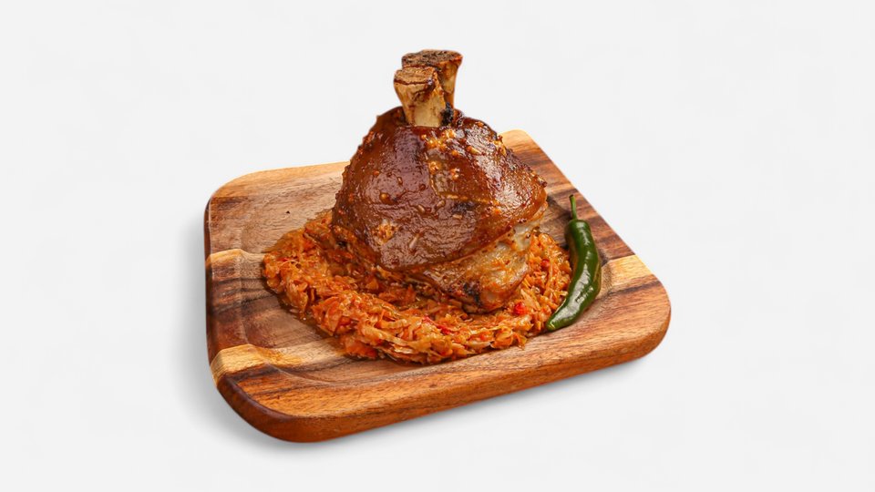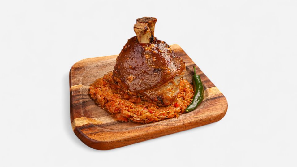 Ciolan de porc, muștar boabe , varză călită, pastă tomate, ketchup, ardei gras, ceapă, morcovi, ulei, sare, miere, ardei iute, suc de lămâie, piper, coriandru, maioneză (conține ou), sos soia. 550/400/20 g