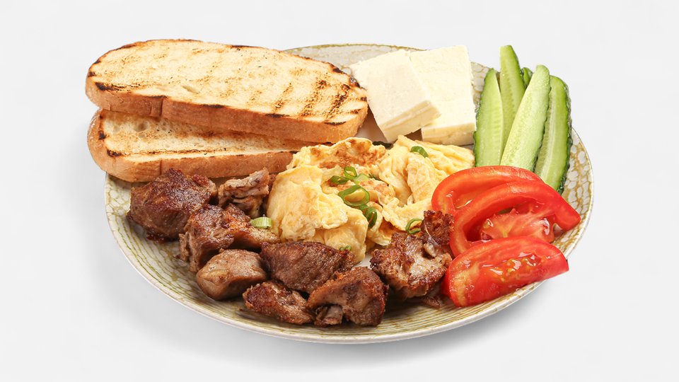 Castraveți, roșii,carne de porc coaptă ,pâine prăjită,telemea de oi,ouă - 450g