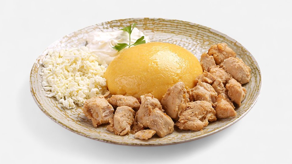 Carne de pui, ceapă, condimente, mămăligă, lapte, smântână, telemea de oi, usturoi, verdeță 180/200/50/30 gr