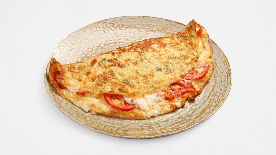 Ouă, roșii, ardei gras, cascaval, smântână de gătit, ceapă verde 250 g