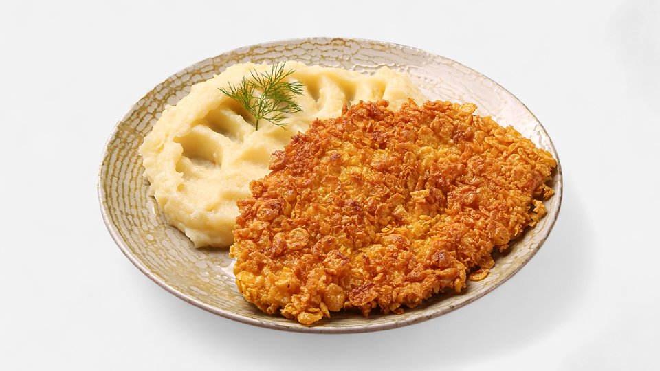 Piept de pui, ouă, făină, pesmet, lapte, cartofi pai, sare, ulei, sos 200/150 gr