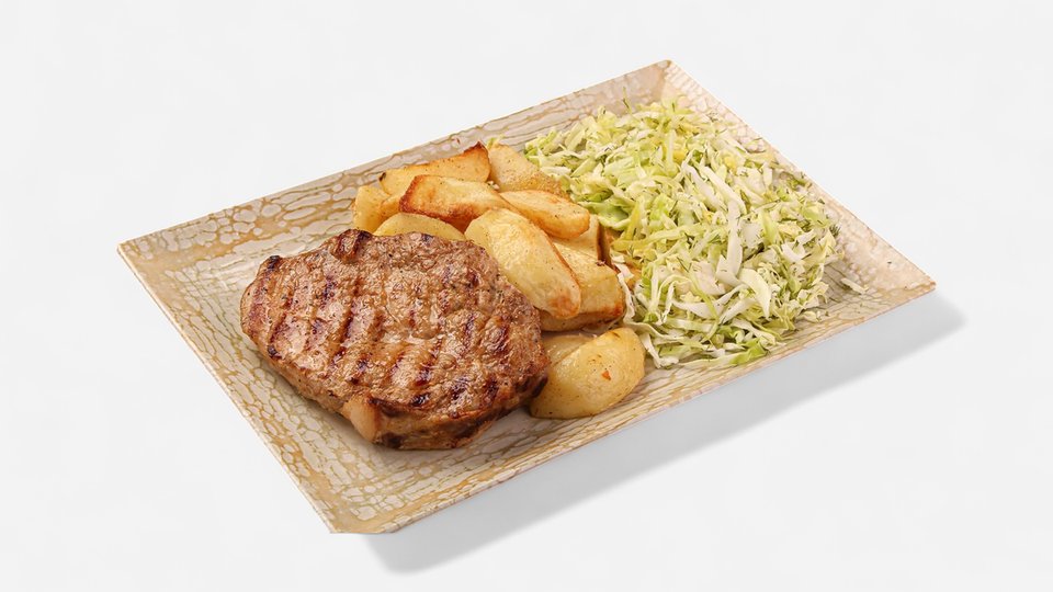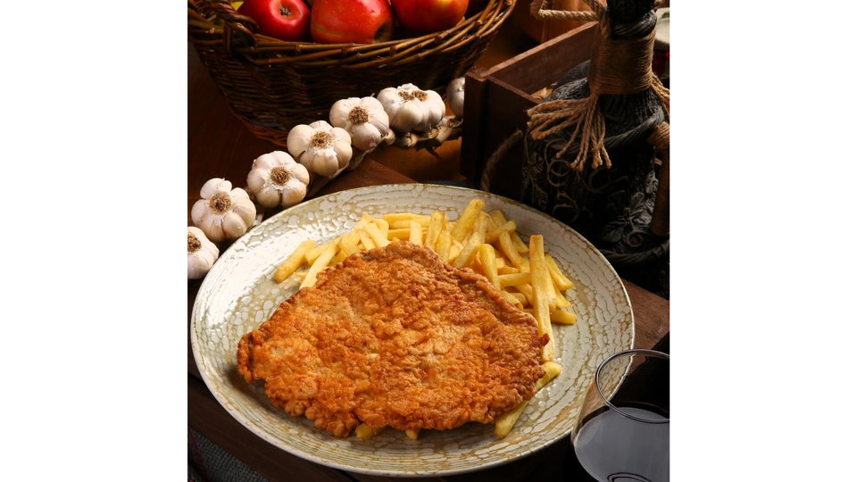 Carne de porc, făină, oua, ulei, cartofi pai 200/150 gr