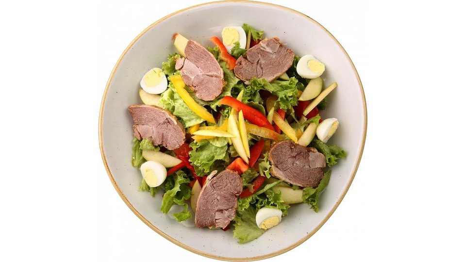 Carne coaptă de curcan, roșii, ardei gras, țelină, mere, salată lollo, ouă prepeliță, ceapă roșie, ulei de masline, verdeață 320 g