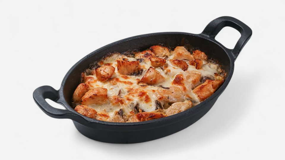 Somon, cartofi, cașcaval, smântână de gătit, ciuperci, condimente 350 g