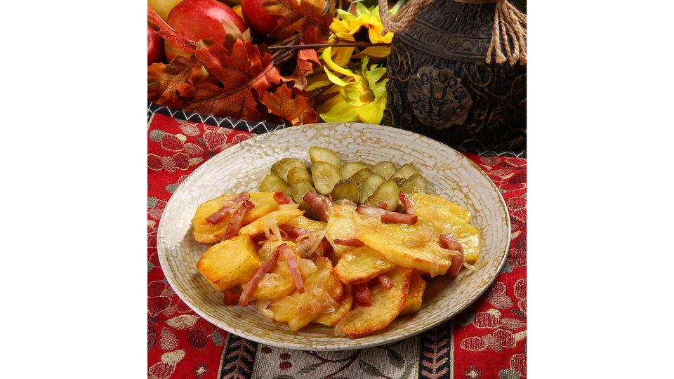 Cartofi, bacon, castraveți marinati, ceapă, usturoi, verdeață, sare, ulei 270 g / 50 g
