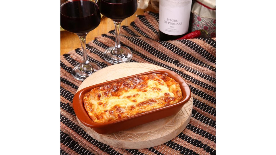 Carne de porc, ceapă, condimente, mămăligă, cremă de gătit, lapte, telemea de oi, cașcaval 450 gr