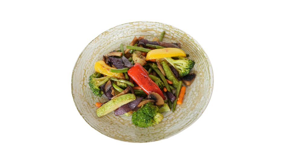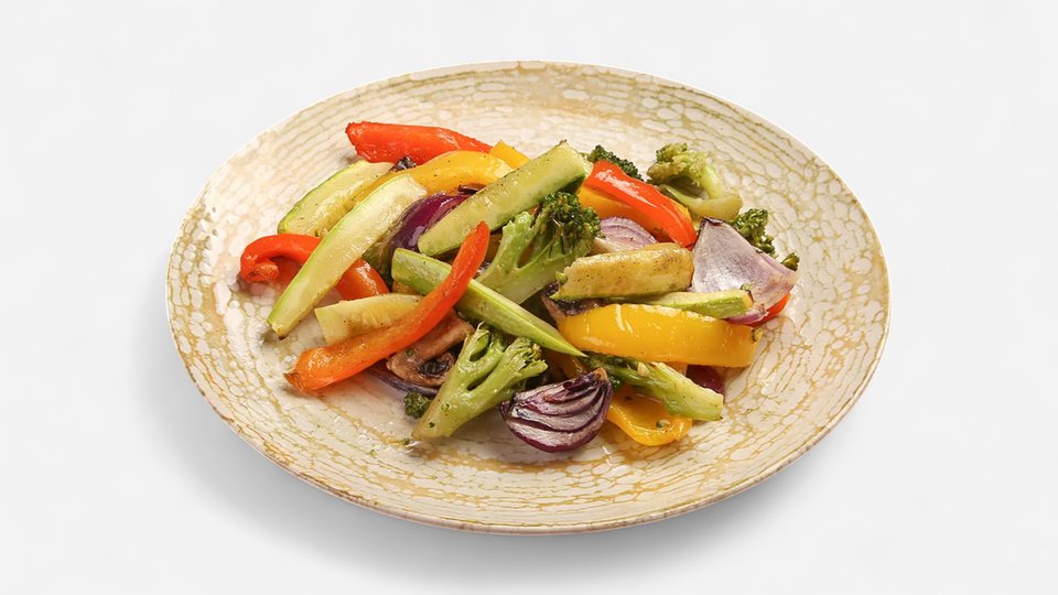 Dovlecel,ardei gras, broccoli,ciuperci,ceapă roșie,ulei de floarea soarelui,sare, piper. 320 gr