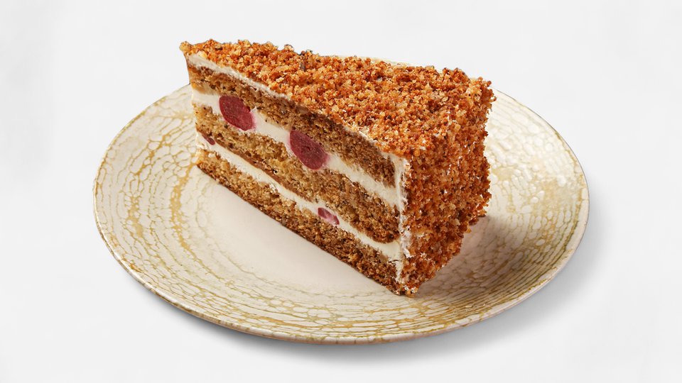 Smântână, mascarpone, ouă, zahăr, făină, unt 82%, miere, miez de nucă, alune de pădure, vișine, bicarbonat, aromă de vanilie. - 150g