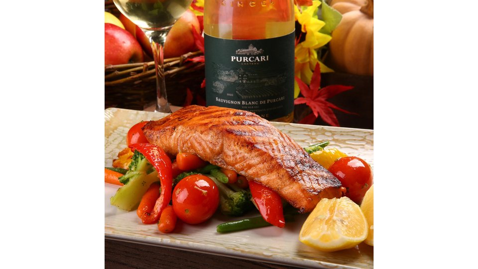 File de somon, broccoli, roșii, fasole verzi, morcovi, ardei gras, lămâie, usturoi 200/150/20