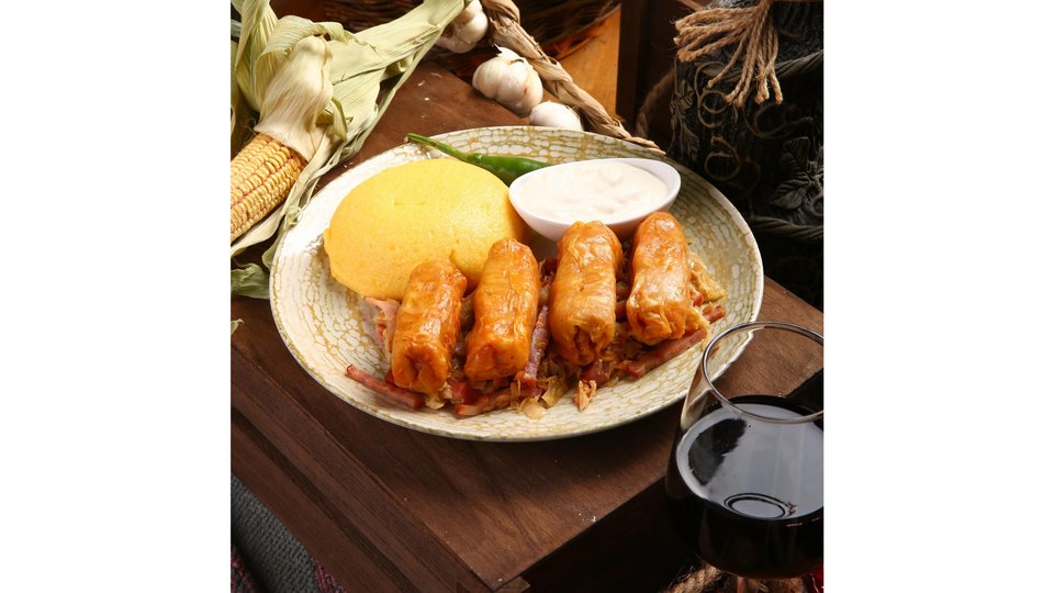 Sarmale cu carne de porc, bacon, mămăligă, lapte, varză călită, ardei iute, smântână 200/100/50/20 g